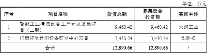 大鵬工業此次IPO募投項目亦圍繞“智能清洗+視覺檢測”領域展開。其中,“智能工業清洗設備生產研發基地項目(二期)”和“機器視覺檢測設備研發中心項目”的原計劃投資金額分別為9,460.42萬元和3,430.24萬元,項目實施主體分別為大鵬工業和控股子公司華耐視。