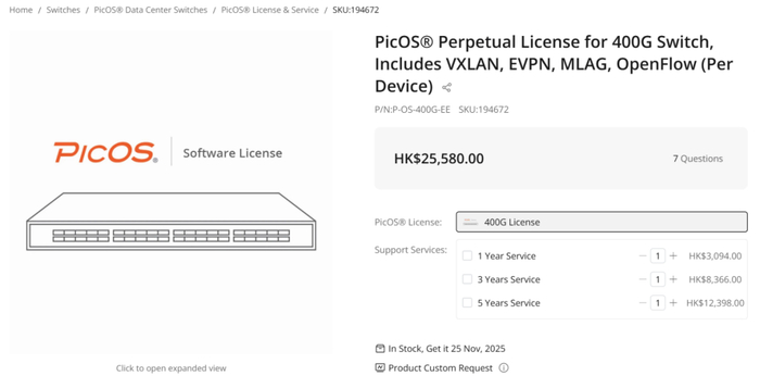 通過在FS.COM查詢基于博通Tomahawk系列芯片的交換機報價,目前32端口、400G白牌交換機的報價約1.5~2萬美元;64端口、400G白牌交換機的報價約2.5~3萬美元,64端口、800G白牌交換機的報價約4~7萬美元。