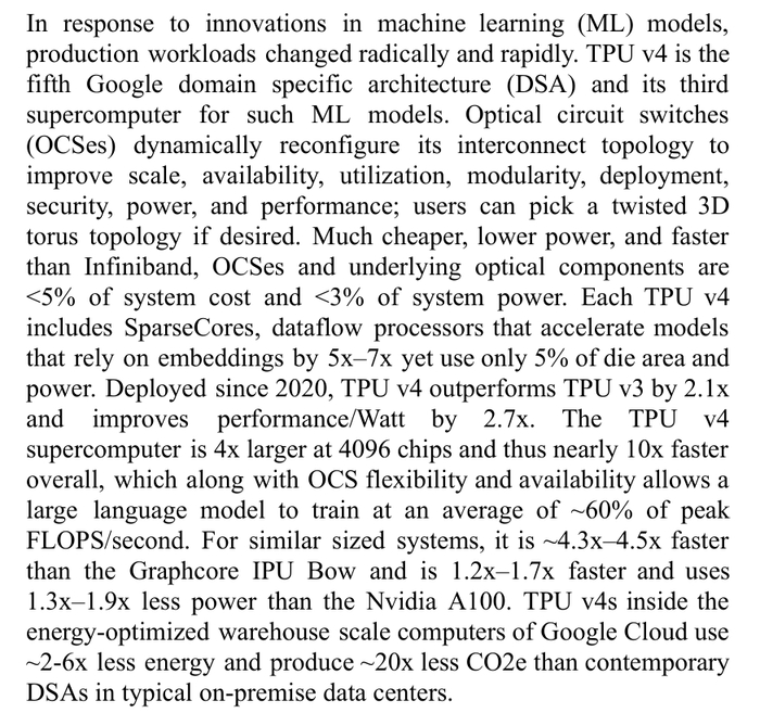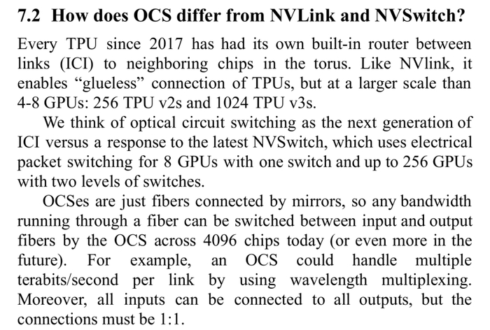 谷歌曾于2023年在ISCA上發表論文《TPUv4: An Optically Reconfigurable Supercomputer for Machine Learning with Hardware Support for Embeddings》,這篇論文是關乎谷歌TPU和OCS信息最全面的一篇文章,有關于谷歌數據中心的架構、TPU與OCS的比例、甚至OCS與英偉達NVLink和NVSwitch的對比都有涉及,是研究谷歌產業鏈必讀的文章。