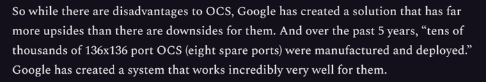谷歌尚未對外出貨OCS,也未公開披露谷歌自己使用了多少臺OCS,這涉及商業機密。