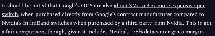 由于谷歌尚未對外銷售OCS,關于OCS的成本并無公開信息可以參考,為此,半導體專業分析機構SemiAnalysis專門寫了一篇分析谷歌AI數據中心的論文《Google AI Infrastructure Supremacy: Systems Matter More Than Microarchitecture》,并在論文中明確提到了:相比于直接從英偉達那里購買InfiniBand,直接從谷歌的合約制造商那里購買OCS交換機,成本要高出3.2倍~3.5倍。