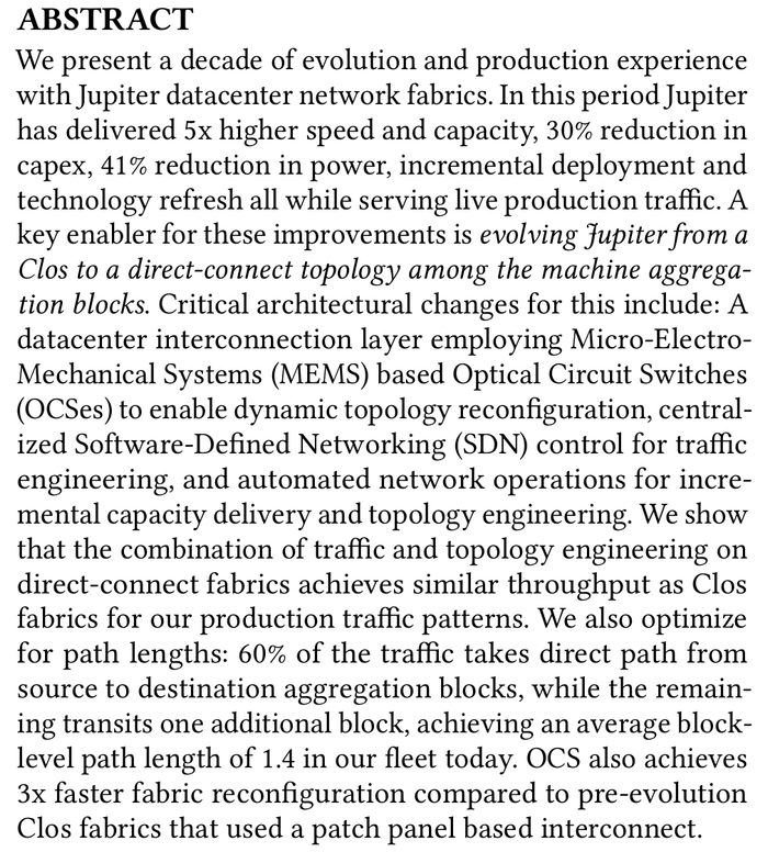 谷歌曾于Google Research上發表論文《Jupiter Evolving: Transforming Google's Datacenter Network via Optical Circuit Switches and Software-Defined Networking》,這是谷歌官方首次大規模公開其數據中心網絡架構演進細節的權威論文。