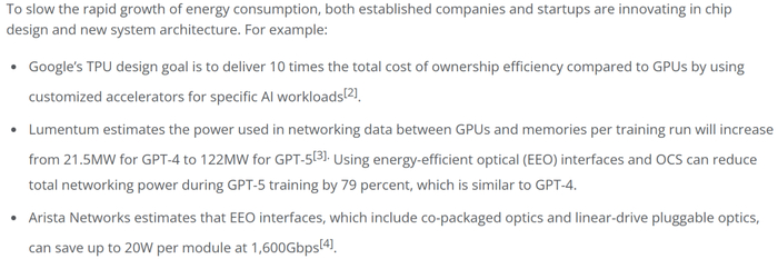 此外,美國半導體巨頭應用材料于2025年4月發表文章《Optical Circuit Switches Show Promise for More Energy-Efficient AI Data Centers》,文中明確表示,利用EEO接口和OCS可以將GPT-5的訓練能耗降低79%。