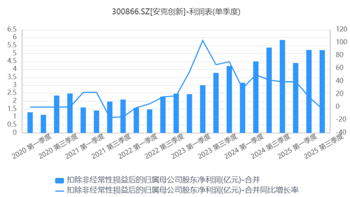 從財務數據來看,充電寶召回事件對安克創新的財務沖擊是直接且顯著的。2025年三季度報告顯示,公司營收雖仍有20%的增長,但扣非凈利潤同比下降2.92%,利潤下滑速度明顯快于收入。這被市場廣泛解讀為一個可能的“從高增長切換到低增長的拐點”信號。
