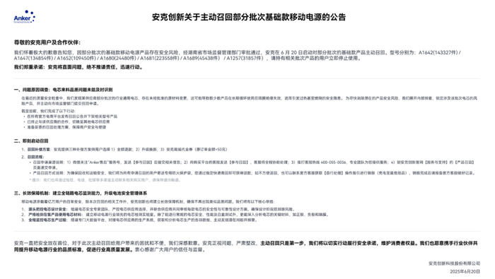 圖片說明:安克創新關于主動召回部分批次基礎款移動電源的公告,數據來源于安克創新官網