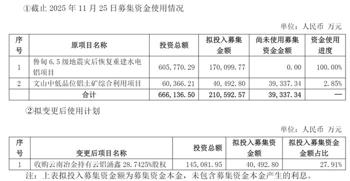 在資金安排方面,云鋁股份擬將"綠色低碳水電鋁材一體化項目"節余募集資金6.25億元(含利息)以及"文山中低品位鋁土礦綜合利用項目"募集資金4.18億元(含利息)變更用途,用于收購云鋁涌鑫28.7425%股權。其中對于文山項目已投入的1155.46萬元,公司將用自有資金進行置換。