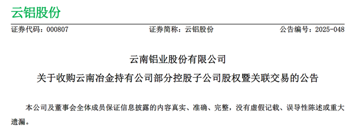 11月25日,云鋁股份發布公告稱,公司擬以22.67億元收購云南冶金集團股份有限公司持有的三家控股子公司少數股權。根據股權關系,中鋁集團為中國鋁業股份有限公司的控股股東,中國鋁業為云鋁股份控股股東,云南冶金為中國銅業有限公司全資子公司。交易雙方均受中鋁集團控制,因而構成關聯交易,可以理解為是集團內部的資源整合。