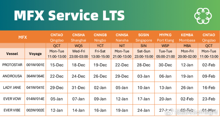據了解,新推出的MFX航線首班航次(PROTOSTAR/2551W)已確定于12月16日從青島始發。MFX航線全程港序為:青島→上海→寧波→南沙→新加坡→巴生→蒙巴薩→青島。