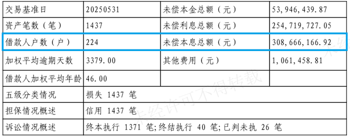 圖片來源于銀登網(wǎng)公告顯示,廣發(fā)銀行廣州分行擬轉(zhuǎn)讓的2025年第1期個人消費及經(jīng)營性貸款,未償本息總額約3.09億元,涉及224戶借款人,加權(quán)平均逾期天數(shù)高達3379天——這意味著部分貸款逾期已超9年。