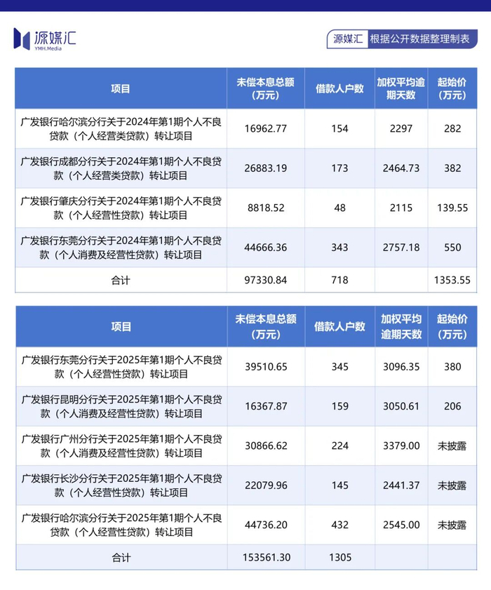 從數(shù)據(jù)維度來看,這并非孤立事件。截至2025年12月2日,廣發(fā)銀行已有東莞、昆明、廣州、長沙、哈爾濱等分行披露了個人不良貸款轉(zhuǎn)讓項目,涉及1305戶借款人,合計規(guī)模約15.35億元,遠超2024年全年。