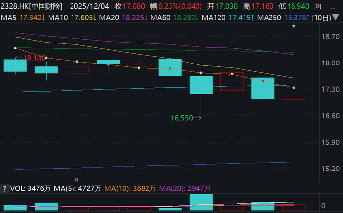 截至12月4日收盤,人保財險的股價為17港元,市值3781億港元。