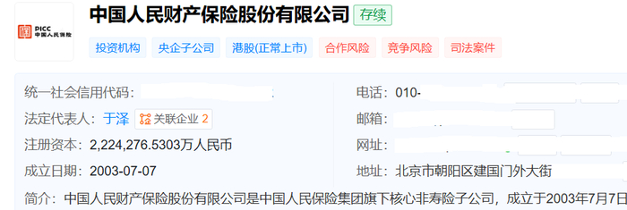 天眼查顯示,人保財險成立于2003年7月7日,注冊資本222.43億元,法定代表人于澤。