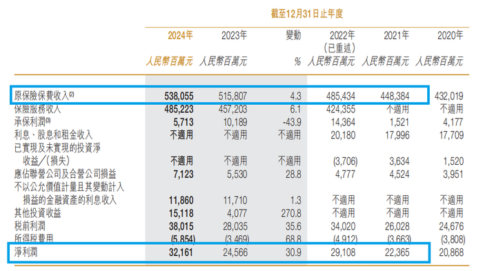 財務(wù)數(shù)據(jù)顯示,這四年間,人保財險的經(jīng)營指標呈現(xiàn)“保費與凈利潤雙增” 態(tài)勢:保費收入從2021年的4483.84億元增至2024年的5380.55億元,復合年均增速約為6.3%;凈利潤從2021年的223.65億元增至2024年的321.61億元,四年增長近百億元。