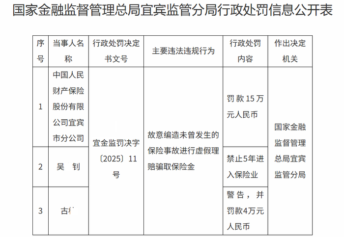 11月24日,因“故意編造未曾發(fā)生的保險事故進行虛假理賠騙取保險金”,人保財險宜賓分公司被宜賓金融監(jiān)管分局罰款15萬元,兩名相關(guān)責任人,一人被“禁止5年進入保險業(yè)”,另一人被“警告,并罰款4萬元”。