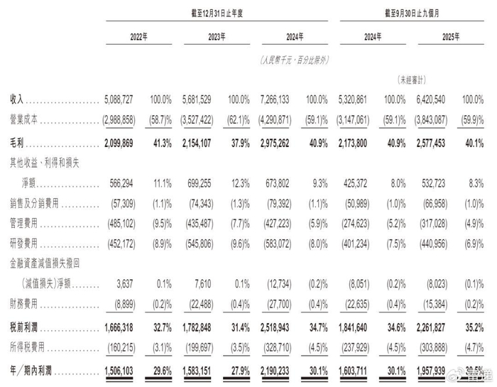 三環集團2025年前9個月營收為64.21億元,較上年同期的53.21億元增長20.67%;毛利為25.77億元,上年同期的毛利為21.74億元;毛利率為40.1%;期內利潤為19.58億元,期內利潤率為30.5%。