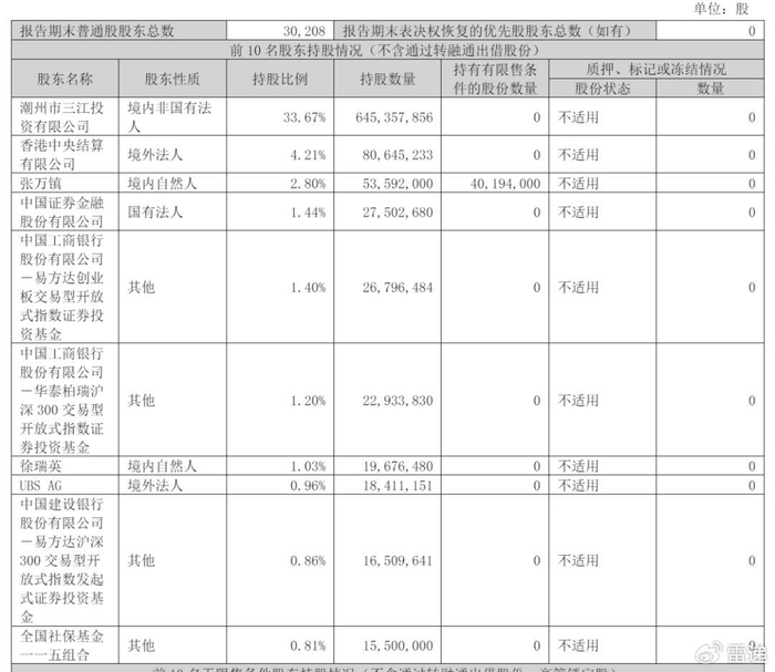 截至2025年9月30日,潮州市三江投資有限公司持股為33.67%,香港中央結算有限公司持股為4.21%,張萬鎮持股為2.8%,中國證券金融股份有限公司持股為1.44%,中國工商銀行股份有限公司-易方達創業板交易型開放式指數證券投資基金持股為1.4%;