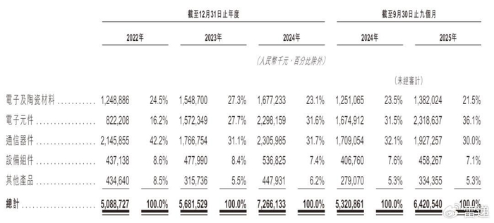 三環集團2025年來自電子及陶瓷材料收入為13.82億元,占比為21.5%;來自電子元件收入為23.19億元,占比為36.1%;來自通信器件收入為19.27億元,占比為30%;來自設備組件收入為4.58億元,占比為7.1%;來自其他產品收入為3.34億元,占比為5.3%。