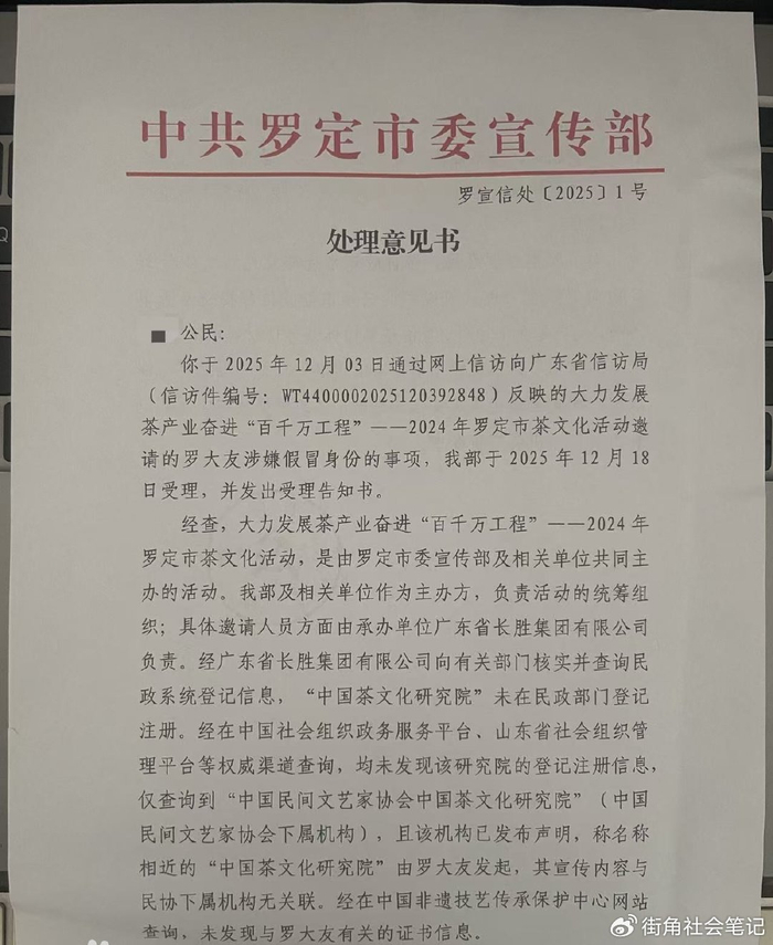 公開信息顯示,此前羅大友曾以“中國茶文化首席非遺傳承人”“中國茶文化研究院院長”等身份,參與羅定市?塘鎮(zhèn)天子茶場(chǎng)相關(guān)茶文化活動(dòng),并接受本地媒體報(bào)道,相關(guān)內(nèi)容還提及其為當(dāng)?shù)夭璁a(chǎn)業(yè)發(fā)展建言獻(xiàn)策、被本地企業(yè)聘請(qǐng)為顧問等細(xì)節(jié)。此外,部分網(wǎng)絡(luò)平臺(tái)及商業(yè)媒體發(fā)布的羅定茶產(chǎn)業(yè)相關(guān)宣傳內(nèi)容中,也多次引用羅大友上述身份信息及相關(guān)言論。